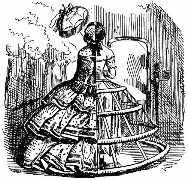 Pour remédier à ces désagréments, on commença à fabriquer des jupons renforcés par des cerceaux de baleine ou d'osier. En 1856 fut inventée la crinoline « cage » (brevet de l'américain W.S. Thompson), formée de cerceaux baleines ou de lames d’acier flexibles reliés entre eux par des bandes de tissus et attachés à une ceinture, qui reprit à son compte le nom de crinoline ; elle remplaça le jupon de crin jusqu'au début des années 1870[1]. Ce nouveau modèle était beaucoup plus léger que ses prédécesseurs et dispensait la femme de porter plus d'un jupon par-dessus la crinoline (pour éviter que les cerceaux ne formassent un relief disgracieux sur la robe) et un autre, moins ample, en dessous, pour garantir sa pudeur si jamais l'appareil se soulevait lors d'un coup de vent ou d'une valse enlevée.